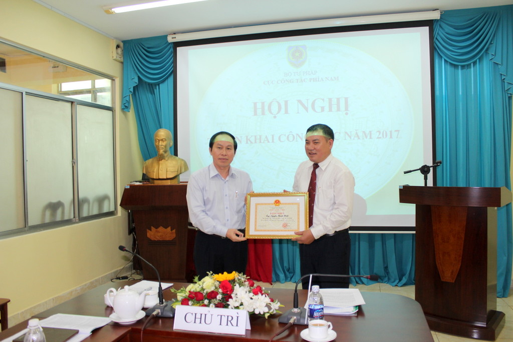 Tại Hội nghị, đồng chí Lê Tiến Châu - Thứ trưởng Bộ Tư pháp đã trao tặng Bằng khen của Bộ trưởng Bộ Tư pháp cho đồng chí Nguyễn Thanh Bình - Cục trưởng Cục Công tác phía Nam.