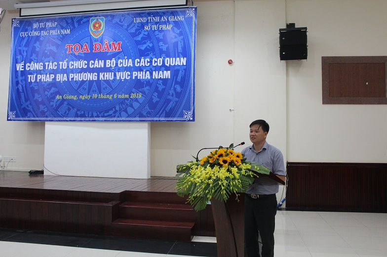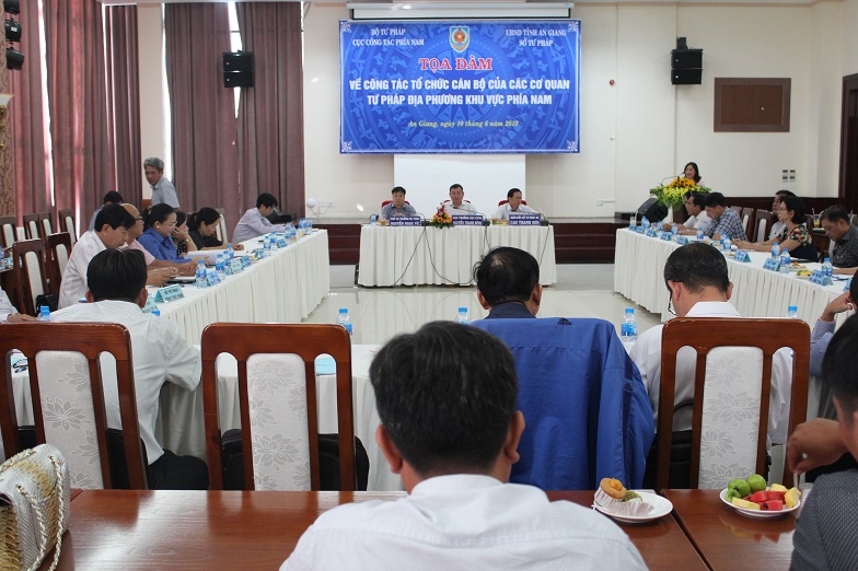 Cùng trong Kế hoạch tổ chức Hội nghị, Hội thảo, Tọa đàm được Bộ trưởng Bộ Tư pháp phê duyệt, chiều 10/6/2019, Cục Công tác phía Nam – Bộ Tư pháp đã phối hợp Sở Tư pháp An Giang tổ chức Tọa đàm về công tác tổ chức cán bộ của các cơ quan tư pháp địa phương tại khu vực phía Nam. Tọa đàm do ông Nguyễn Thanh Bình – Cục trưởng Cục Công tác phía Nam, ông Nguyễn Ngọc Vũ – Phó Vụ trưởng Vụ Tổ chức cán bộ và ông Cao Thanh Sơn – Giám đốc Sở Tư pháp An Giang đồng chủ trì.