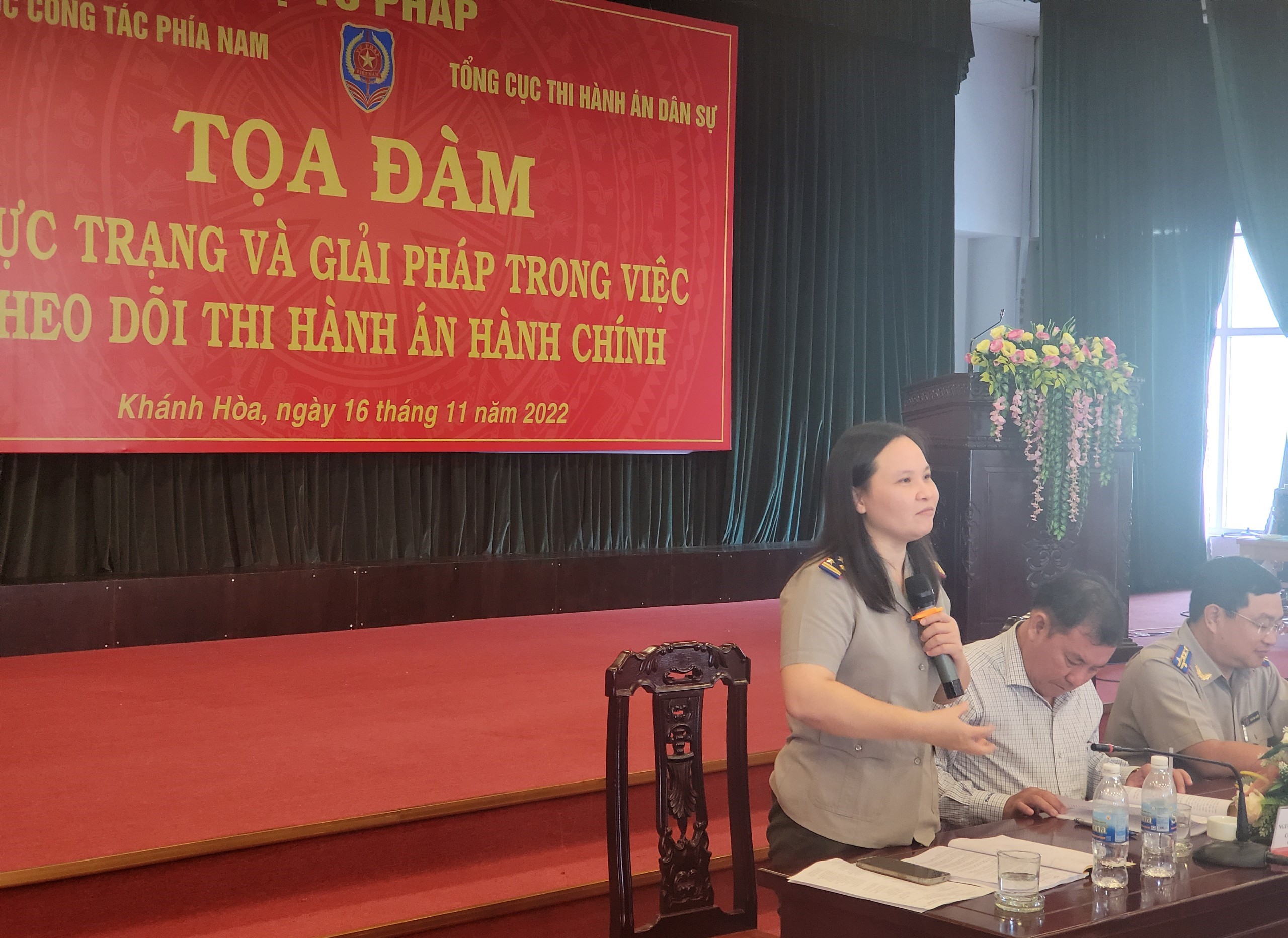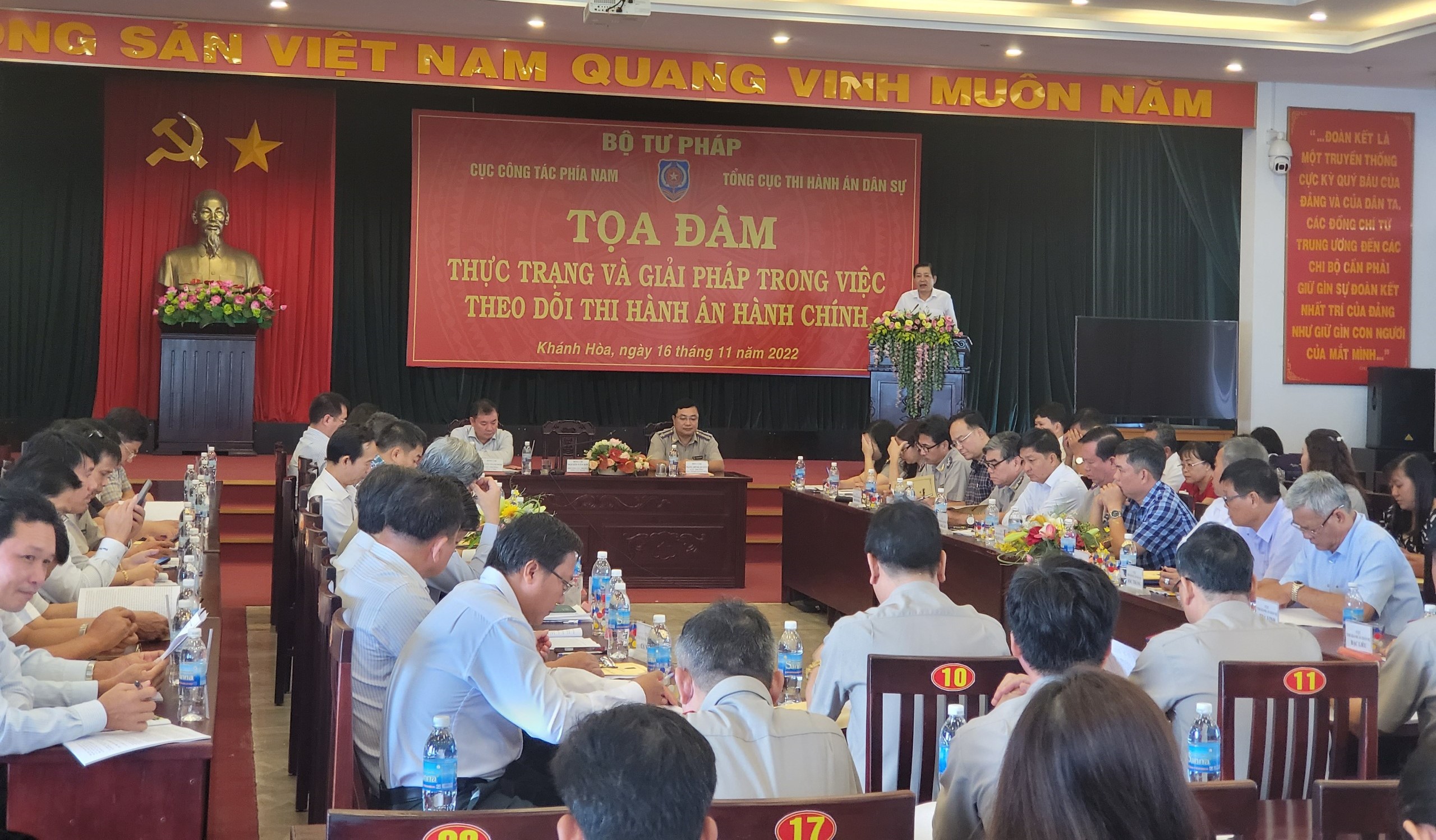 Tọa đàm do ông Nguyễn Thanh Bình - Cục trưởng Cục Công tác phía Nam, ông Nguyễn Văn Sơn - Phó Tổng cục trưởng Tổng cục THADS, ông Đặng Đình Quyền – Cục trưởng Cục THADS tỉnh Khánh Hòa đồng chủ trì. Tham gia Tọa đàm có đại diện Lãnh đạo 25 Cục THADS; Trưởng phòng Nghiệp vụ và tổ chức thi hành án thuộc 25 Cục THADS trong khu vực phía Nam; Lãnh đạo các đơn vị thuộc Cục và một số Chi cục THADS có thụ lý và gặp khó khăn, vướng mắc trong công tác này.
