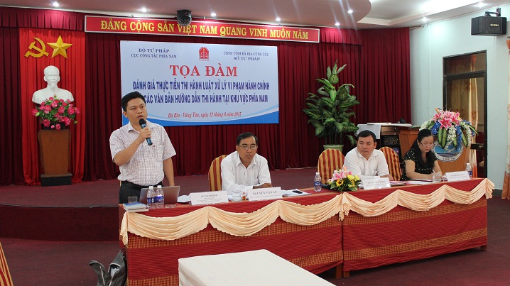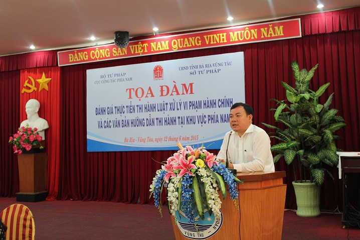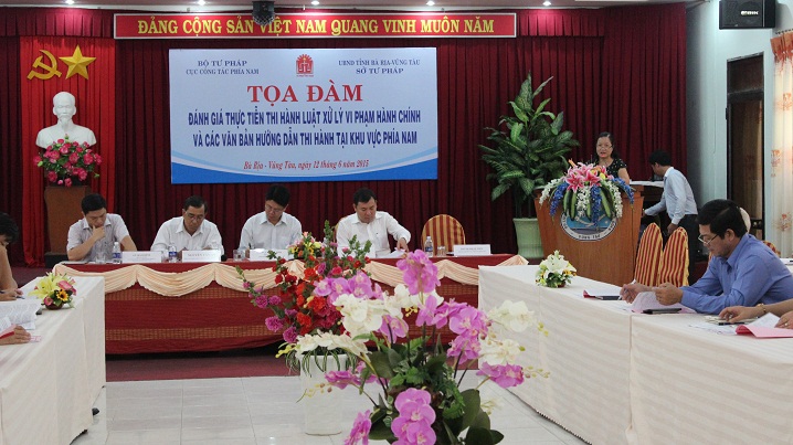 Tọa đàm được tổ chức dưới sự chủ trì của Lãnh đạo Cục Công tác phía Nam, Lãnh đạo Cục quản lý XLVPHC và theo dõi thi hành pháp luật và Lãnh đạo Sở Tư pháp tỉnh Bà Rịa - Vũng Tàu. Tham dự Tọa đàm có hơn 80 đại biểu là Lãnh đạo Sở Tư pháp, Phòng phụ trách công tác quản lý XLVPHC của các Sở Tư pháp trong khu vực phía Nam; đại diện các cơ quan, ban ngành của tỉnh Bà Rịa - Vũng Tàu: Sở Công Thương, Sở Giao thông vận tải, Cục Hải quan, Tòa án nhân dân thành phố Vũng Tàu và Tòa án nhân dân thành phố Bà Rịa. Đồng chí Nguyễn Thanh Tịnh, Phó Chủ tịch UBND tỉnh Bà Rịa - Vũng Tàu cũng đến dự và phát biểu chào mừng. Đồng chí biểu dương kết quả đạt được của Sở Tư pháp tỉnh Bà Rịa - Vũng Tàu và mong muốn qua Tọa đàm sẽ học hỏi được những cách làm hay của các địa phương trong Khu vực, đồng thời kiến nghị Bộ Tư pháp xem xét để tháo gỡ khó khăn cho các địa phương.